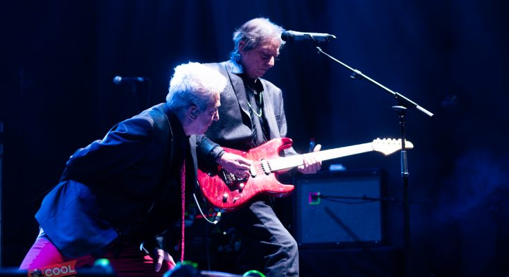 Ya siendo las 21:00 horas, Mario Serra aparece con los músicos de gira levantando las baquetas en señal de que aquí esta lo que tanto esperan. Sin mas presentación, los teclados comienzan con Sin Disfraz, un clásico de golpe que hace ingresar a Marcelo y Julio Moura, dandole la palabra al primero, quien con micrófono en mano canta las primeras estrofas que fueron muy recibidas por el publico, el cual desde el primer momento mostró un interés y alegría de ver a la banda ochentera. Todo lo que Encuentro y Lugares Comunes siguieron rápidamente para mantener la aura que alimentaba la versatilidad de Marcelo, quien sin animo de quedarse quieto, se trasladaba de un costado a otro del escenario, deteniéndose en varias ocasiones junto a su hermano para deleitarse por el sonido de la guitarra. Imágenes Paganas le dio el primer quiebre emocional a la jornada, donde jovenes y no tanto se rindieron a la cautivante melodía de ese teclado apacible, dando la sensación que recordando la voz de Federico Moura y escuchando la letra, hace pensar en una despedida terrenal.