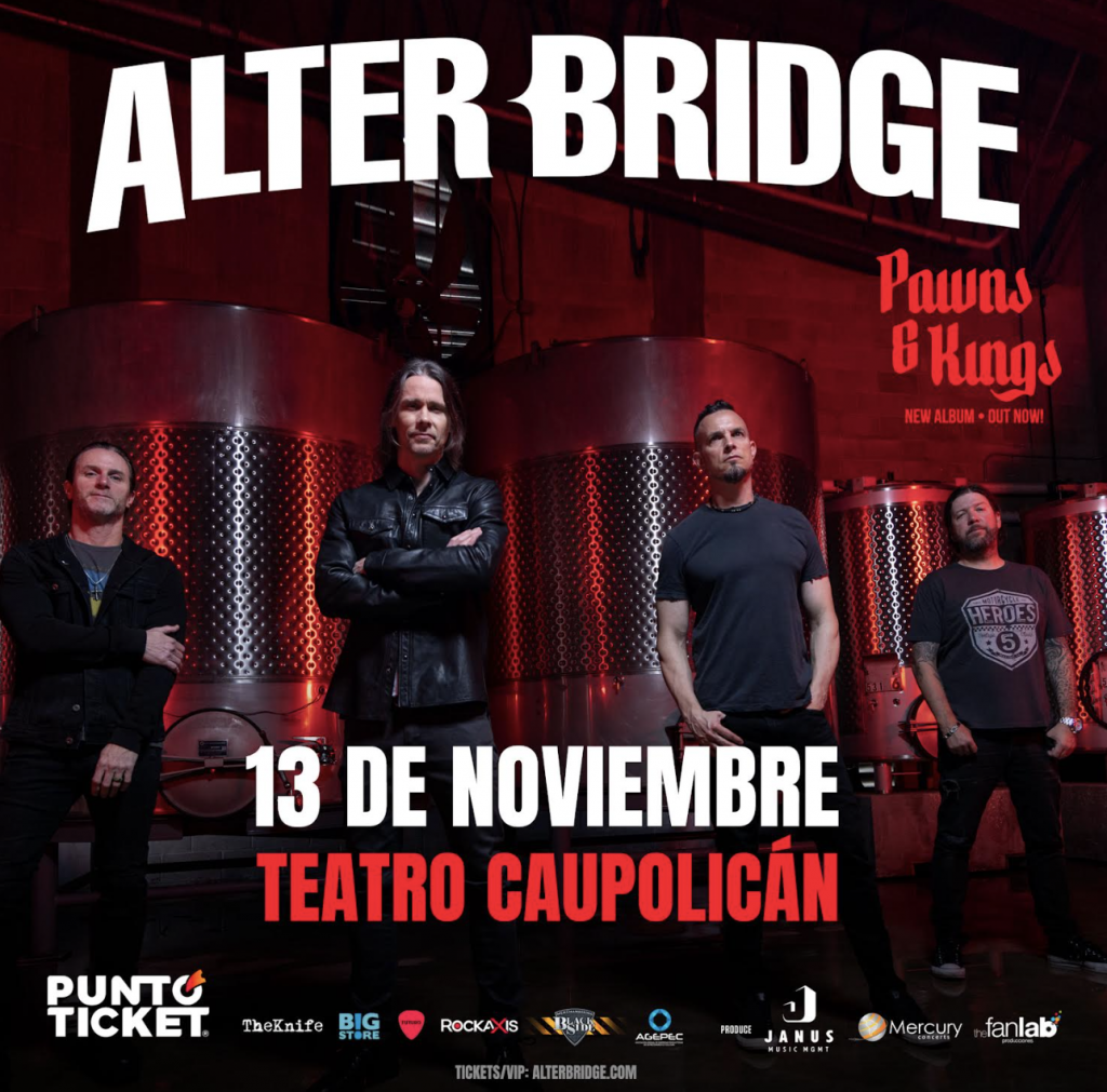 Alter Bridge, se presentará en el Teatro Caupolicán el próximo 13 de noviembre, y las entradas, disponibles en PuntoTicket desde el 30 de agosto, tienen un valor de: Palco $70.000, Cancha $49.000 y Platea $44.000, más cargos por servicio.