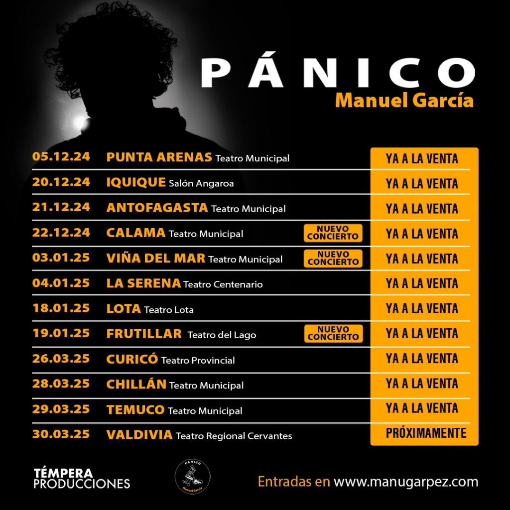 El próximo año 2025 se cumplen 20 años del lanzamiento del primer disco solista del cantautor Manuel García. Desde diciembre de 2024 hasta diciembre de 2025 el ariqueño va a recorrer Chile, parte de Latinoamérica y Europa presentando las 13 canciones que forman el disco PÁNICO, además de algunos de los temas más destacados de su trayectoria y canciones nuevas.