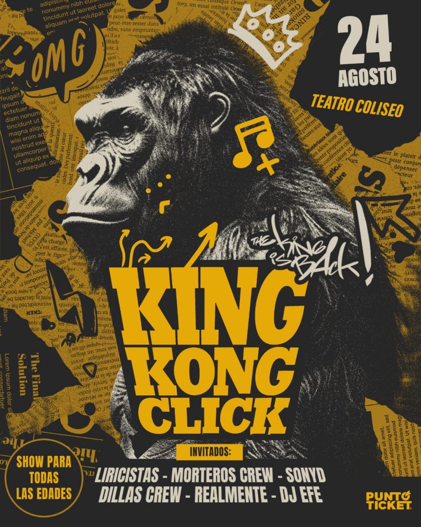 La agrupación chilena de rap King Kong Click (Bubaseta – Suppra – SuBwoffer – bigdehlone y DJ Sadeec) se despide de los escenarios este 24 de agosto del 2024, en Teatro Coliseo, donde promete repasar lo mejor de su repertorio en una fiesta old school de primer nivel. Y eso no es todo, los invitados estelares Liricistas, Morteros Crew, Sony D, Dilla Crew y Dj Efe serán parte de la antesala al magno evento.
