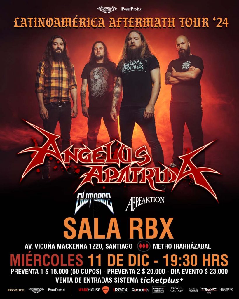 Con ocho álbumes de estudio, Guillermo Izquierdo (voz/guitarra), Davish G. Álvarez (guitarra), José J. Izquierdo (bajo) y Víctor Valera (batería), llegarán a Sala RBX para exponer lo mejor de su repertorio, dando énfasis sobre todo en su último disco “Aftermath”, lanzado en octubre del pasado 2023 y el que es, en palabras de la banda, “el más sincero y poderoso de la historia de Angelus Apatrida y, a la vez, uno de los más pesados y directos”, en donde además se contó con colaboraciones de músicos como Jamey Jasta (Hatebreed), Todd La Torre (Queensrÿche), Pablo García (Warcry) y Sho-Hai (Violadores del Verso).