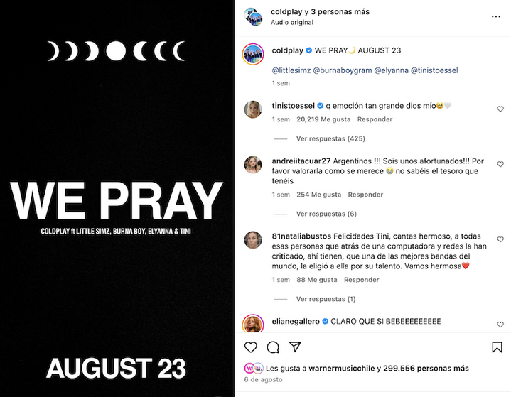 Coldplay anuncia el lanzamiento de su nuevo single “WE PRAY” para el viernes 23 de agosto. La canción cuenta con la participación de la rapera británica Little Simz, la superestrella nigeriana de Afrobeats Burna Boy, la artista fenomenal palestino-chilena de R&B Elyanna y la argentina líder de los charts TINI