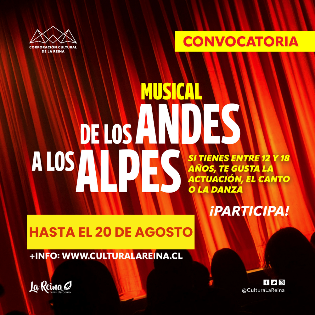 El musical -obra de teatro-, “De Los Andes a Los Alpes”, es una producción chileno-francesa que trata sobre diversidad, integración y migración, que ha extendido su convocatoria hasta el 20 de agosto. Dirigida a niños y jóvenes de entre 12 a 18 años, de cualquier comuna, sin distinción de ningún tipo, que quieran participar como protagonistas de la creación artística y que tengan inquietud por la actuación, el canto y la danza.