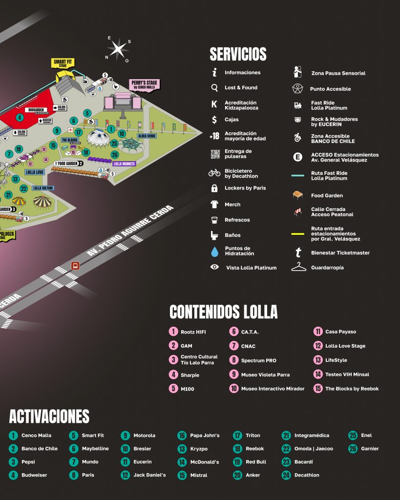 Falta poco más de un mes para que el próximo 21, 22 y 23 de marzo se abran nuevamente las puertas del Parque Cerrillos, recibiendo una nueva versión del evento musical más importante del año: Lollapalooza Chile. Desde ya la producción ha puesto a disposición de los fanáticos el mapa del recinto, además de todas las experiencias que tendrá la fiesta musical más grande del país.